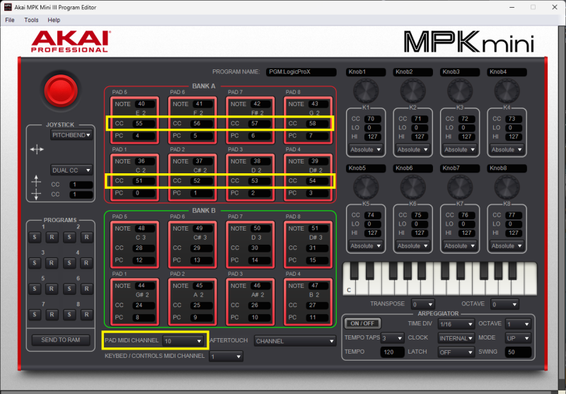 「BANK A」の 「PAD1 ~ PAD8」のCCに「51 ~ 58」として入力。