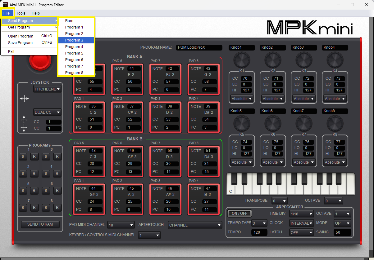 ※ここでは「10」を選択。 - 「File」から「Send Program」をクリックして、今回割り当てる「Program 3」を選択して本体に設定したデータを転送。