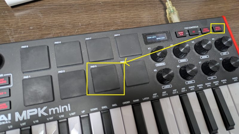 - 「MK3」をPCに接続して右上の「PROG SELECT」を押しながら、設定する任意のPAD番号を選択する。
